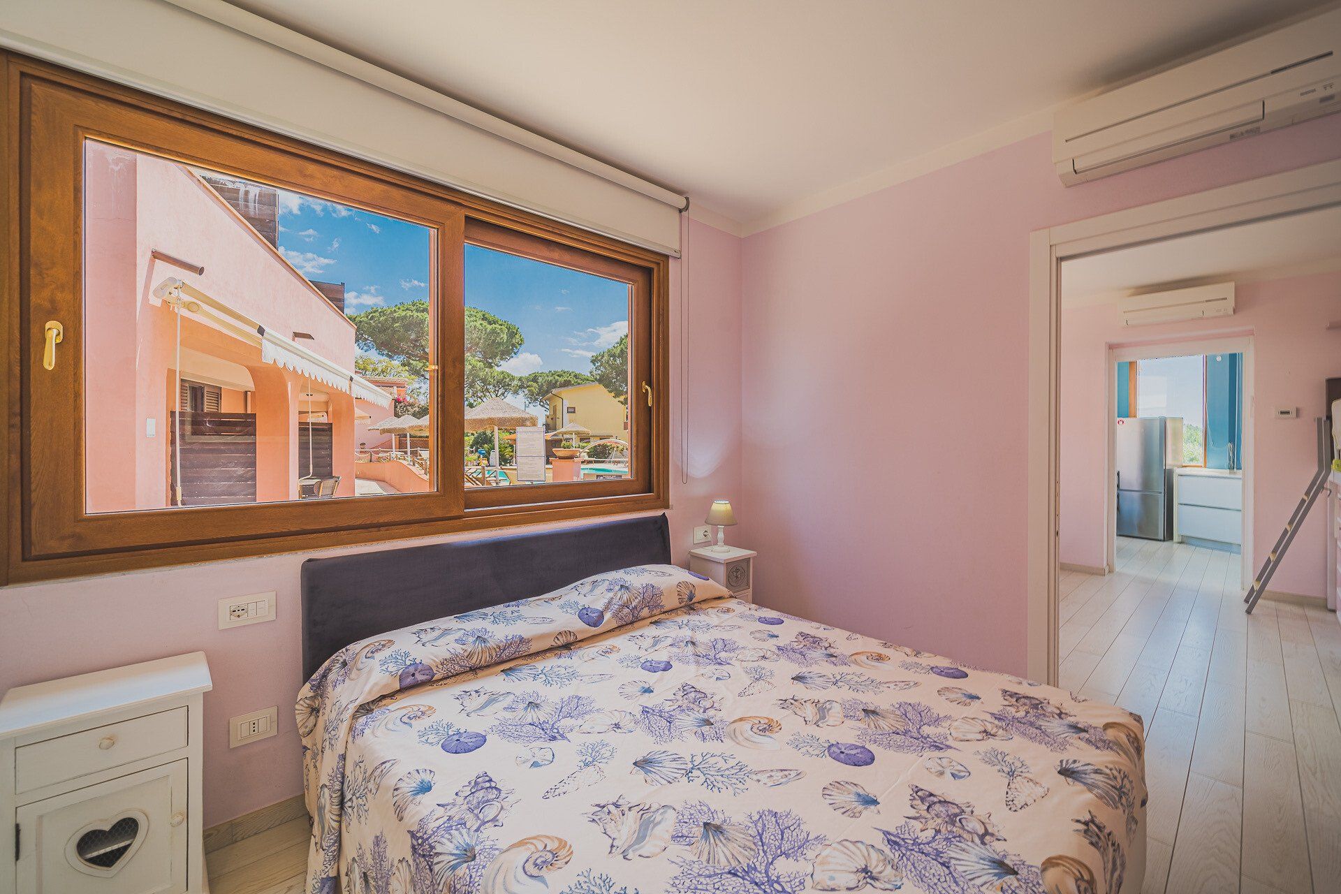 I bilocali a pian terreno fronte piscina, di 40mq circa, sono composti da camera con letto matrimoniale, soggiorno con divano/letto ed angolo cottura con piano ad induzione e bagno con box doccia. Sono inoltre dotati di: