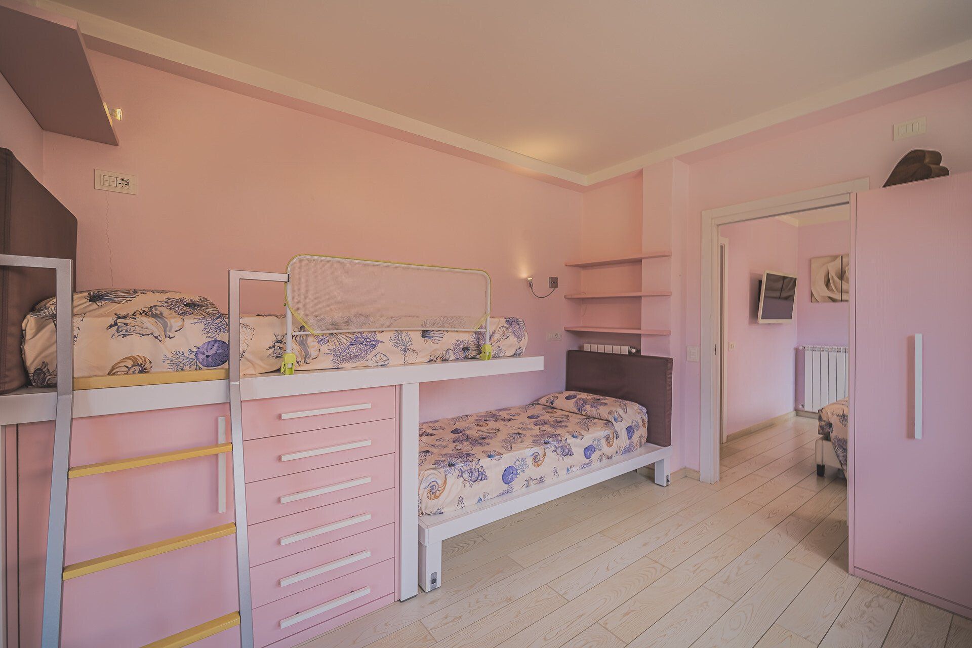 I bilocali al primo piano, di circa 35mq, sono composti da camera con letto matrimoniale, soggiorno con divano/letto ed angolo cottura con piano ad induzione e bagno con box doccia. Sono inoltre dotati di: